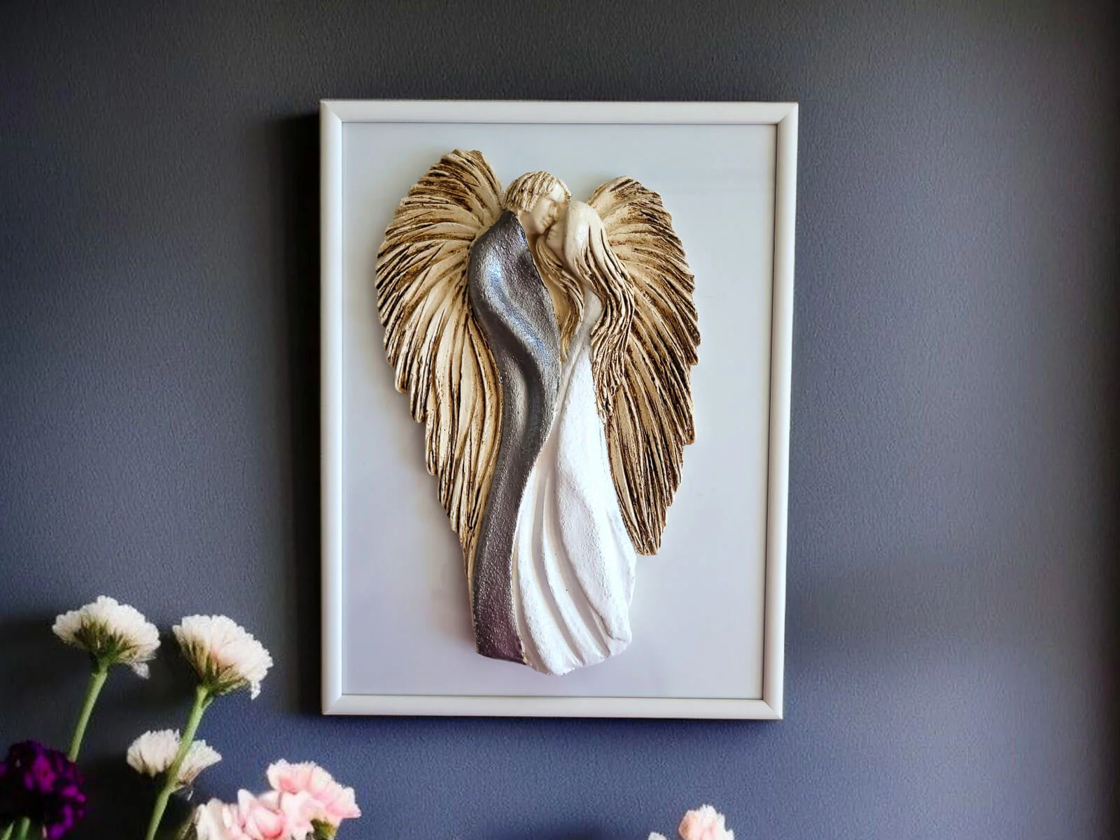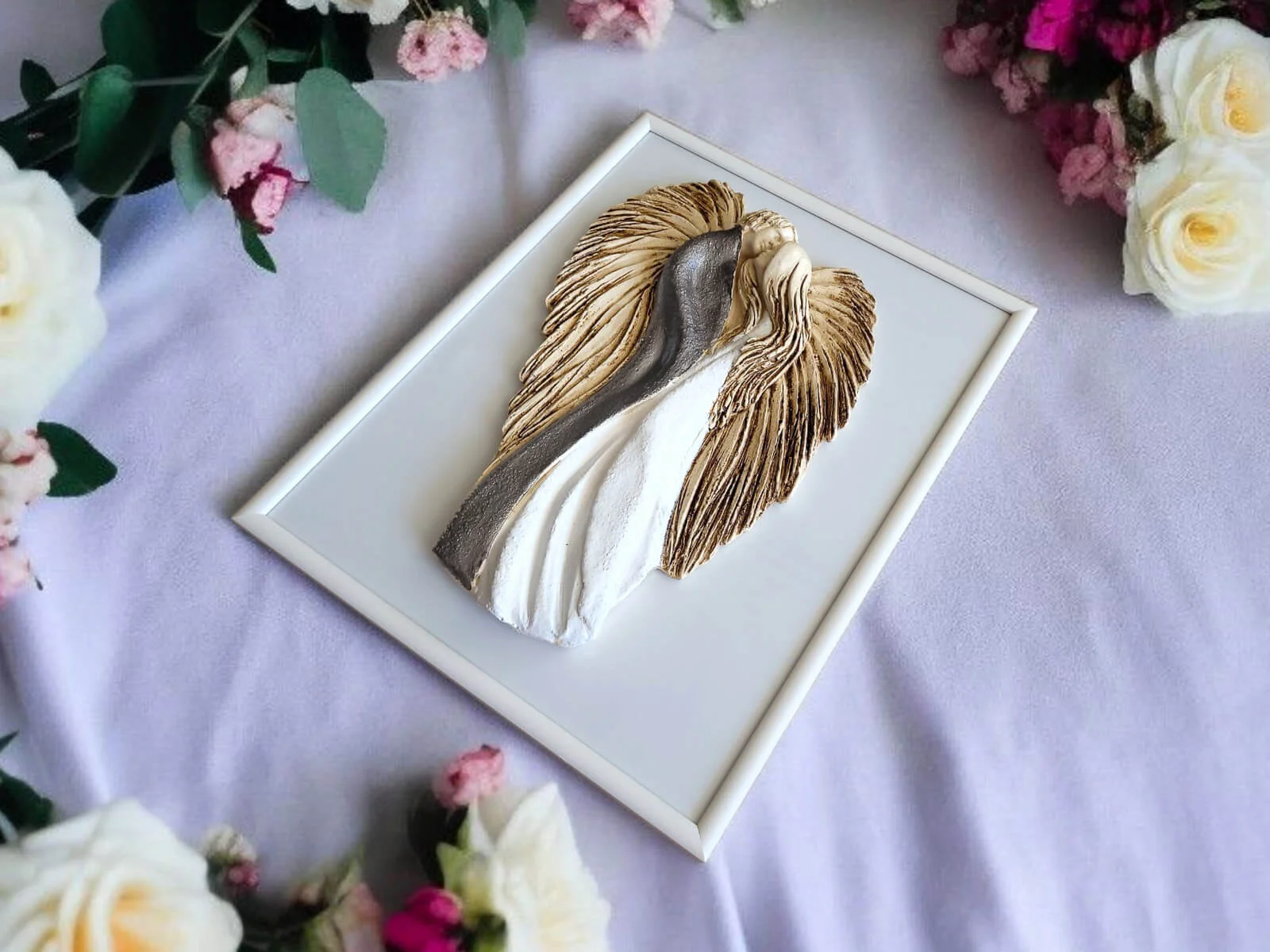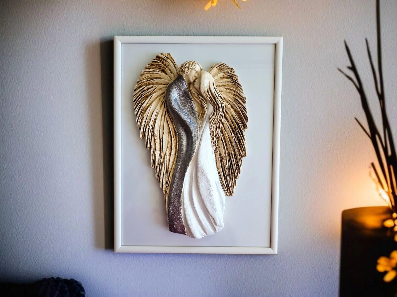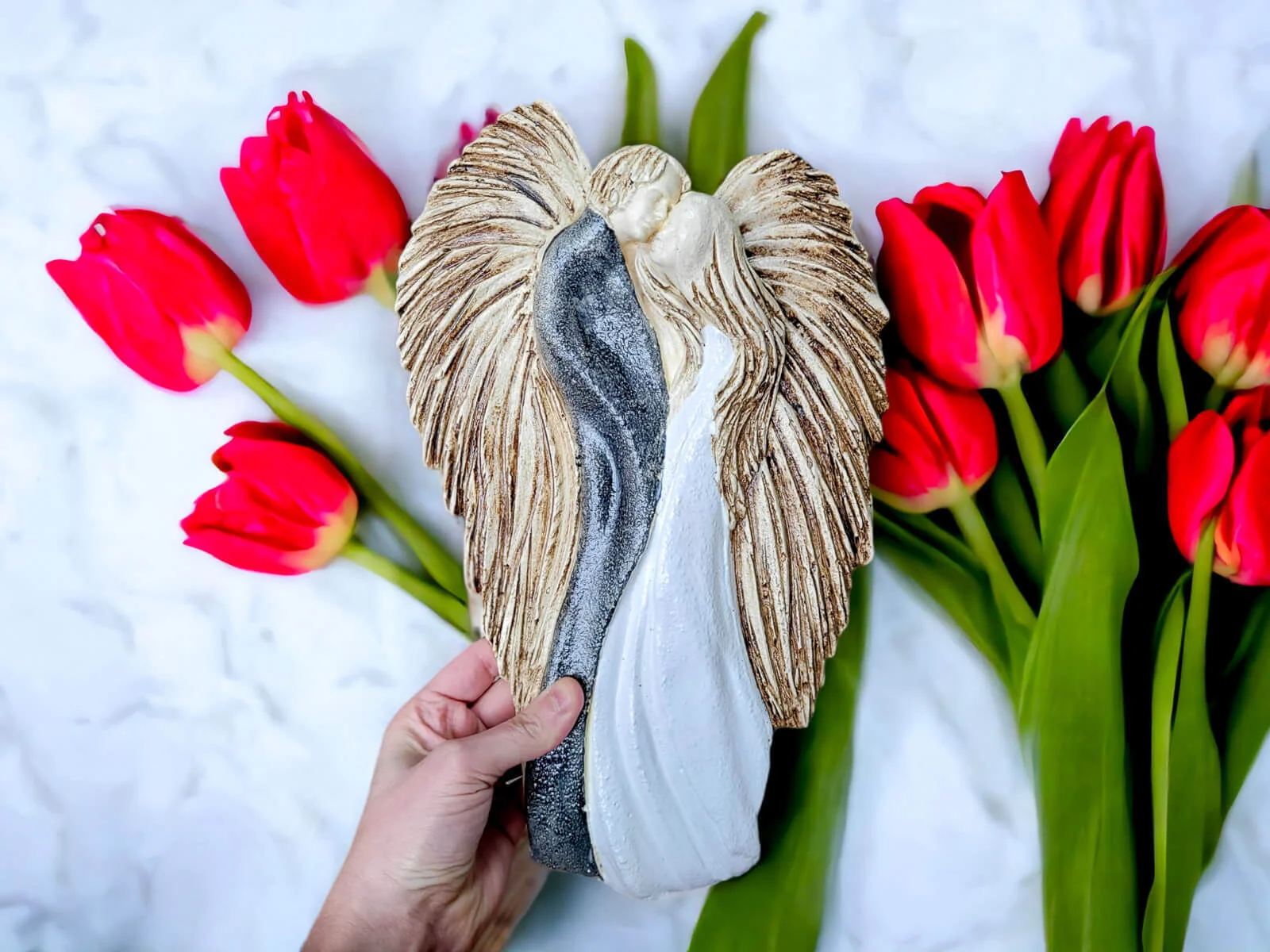 Soll der Engel verschenkt werden, können wir ihn auch elegant in transparentes Zellophan einwickeln und mit ökologischer Schnur umbinden. Dadurch sieht der Engel noch würdevoller aus und ist bereit zum Verschenken. Der Einfachheit halber können Sie auch gleich eine weiße Geschenktüte aus Papier kaufen.