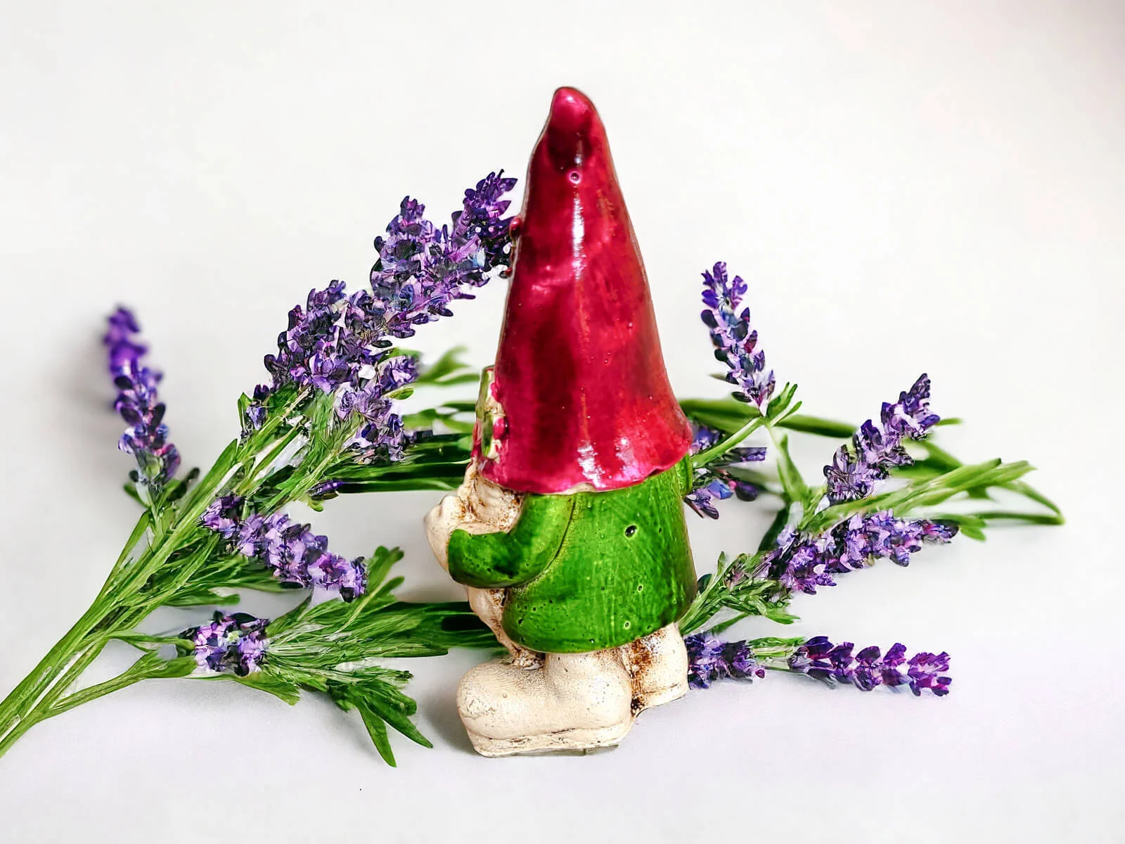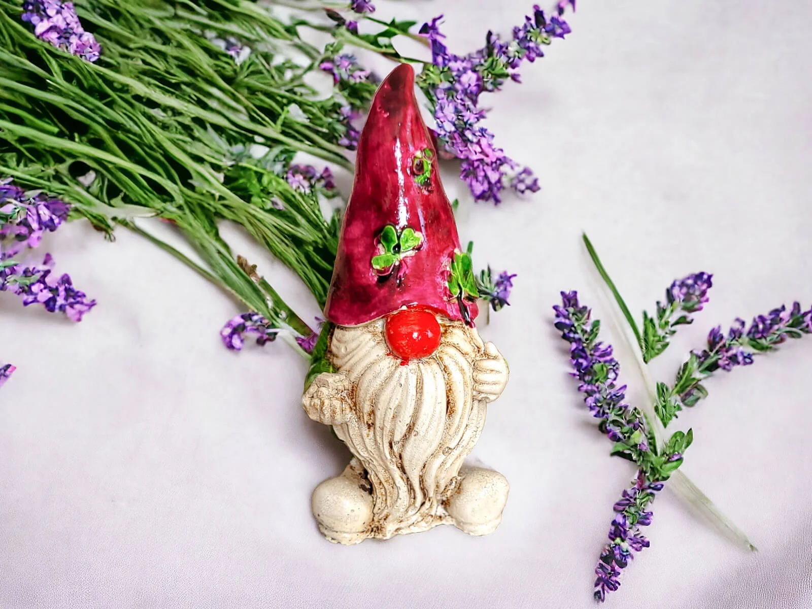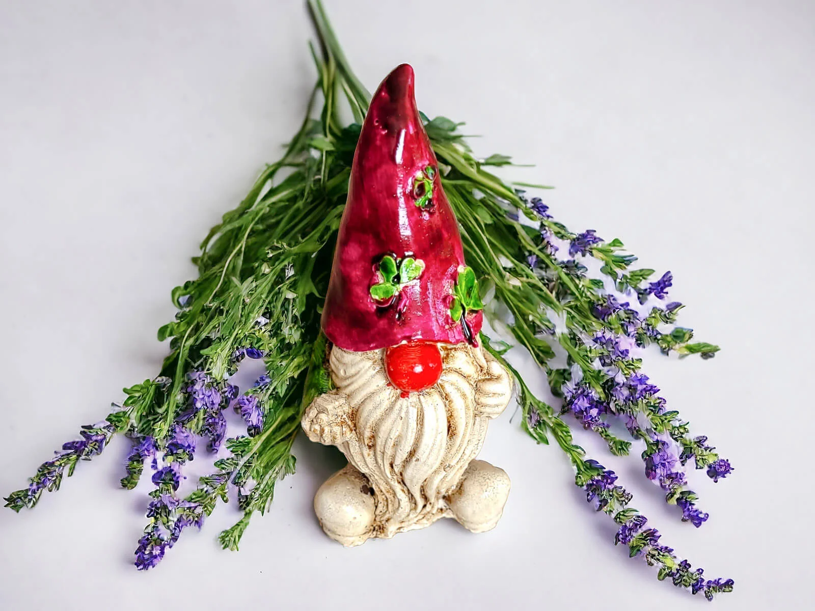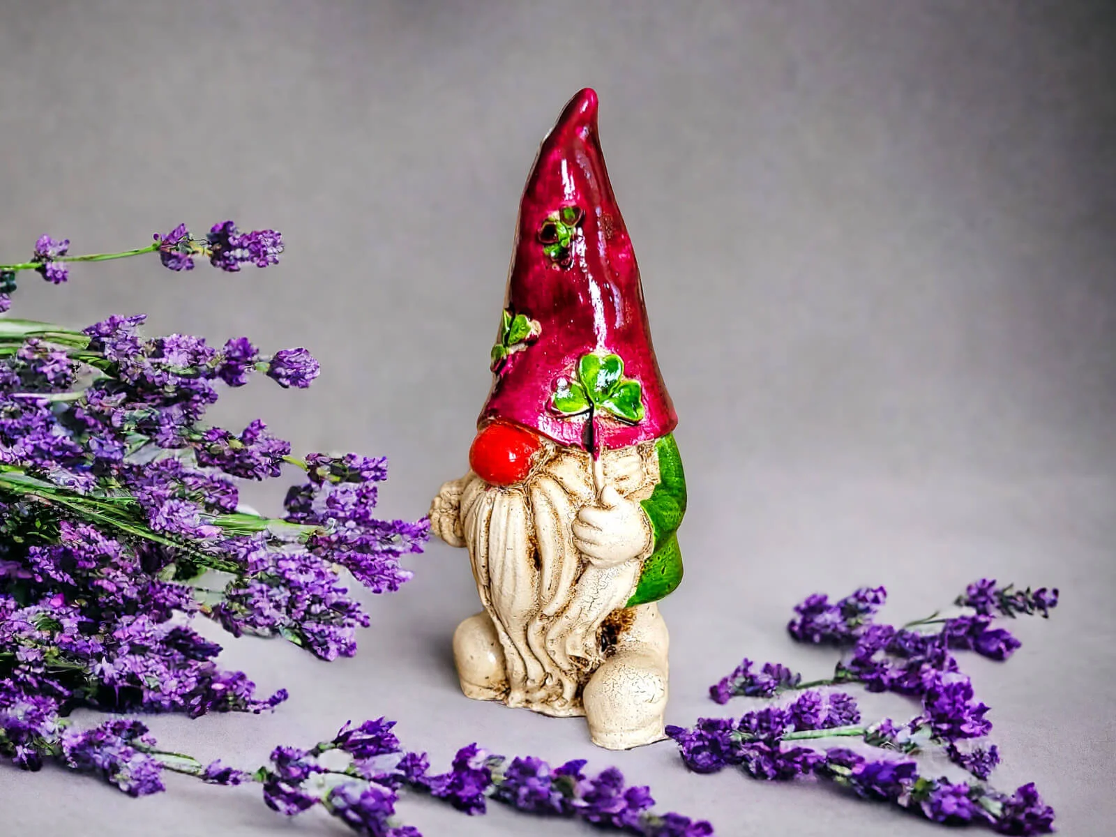 Sein lilafarbener, übergroßer Hut mit langer Spitze dient nicht nur als stilvolles Accessoire, sondern auch als Platz, an dem oft Kleeblätter haften. Diese fünfblättrigen Kleeblätter sind ein Zeichen des Glücks und aufgrund der ihnen zugeschriebenen magischen Eigenschaften gilt der Glückszwerg als Glücksbote.