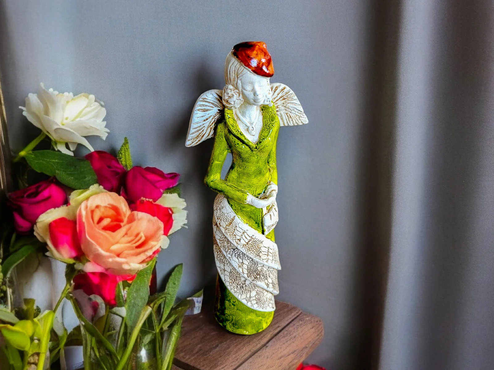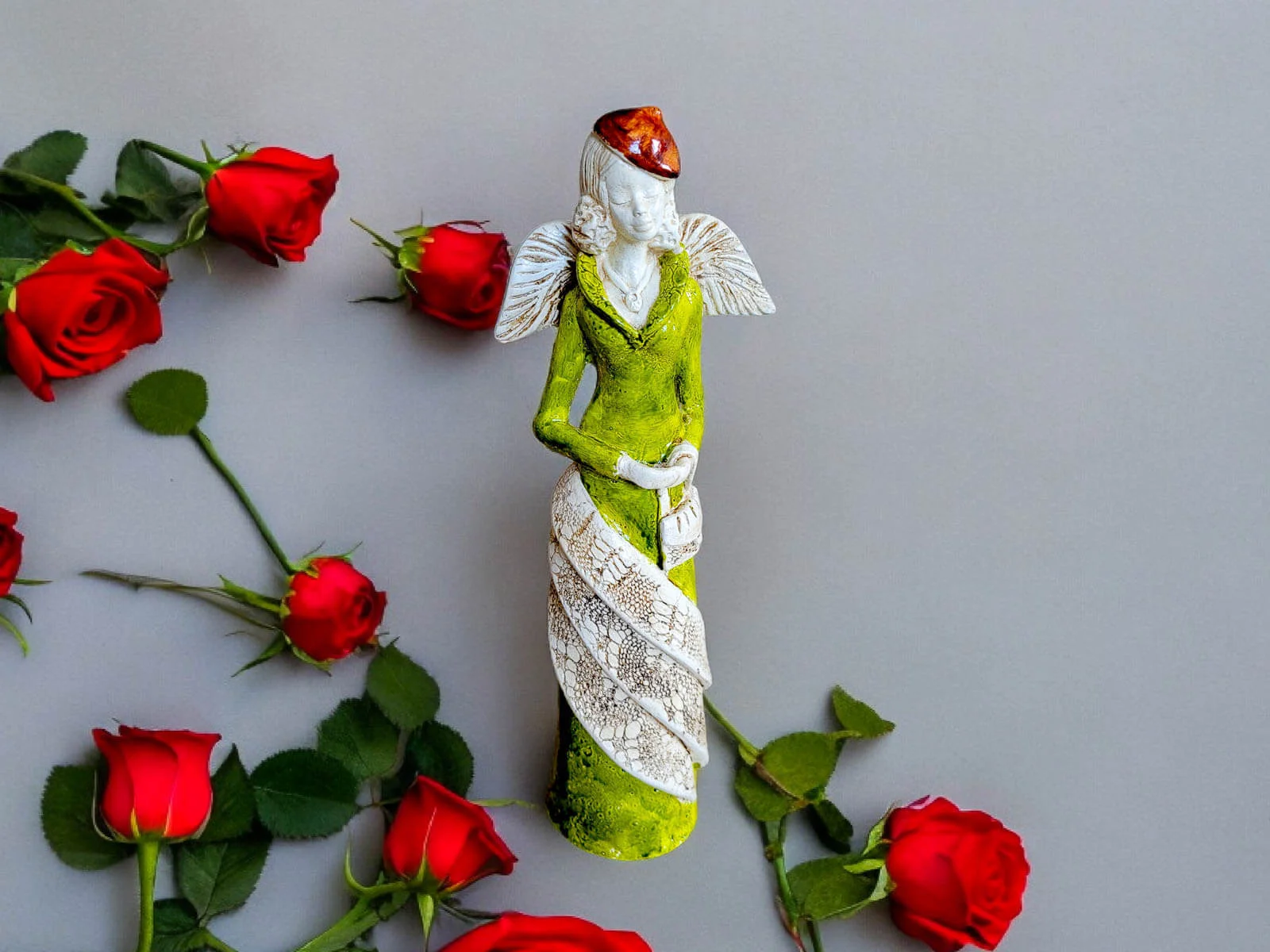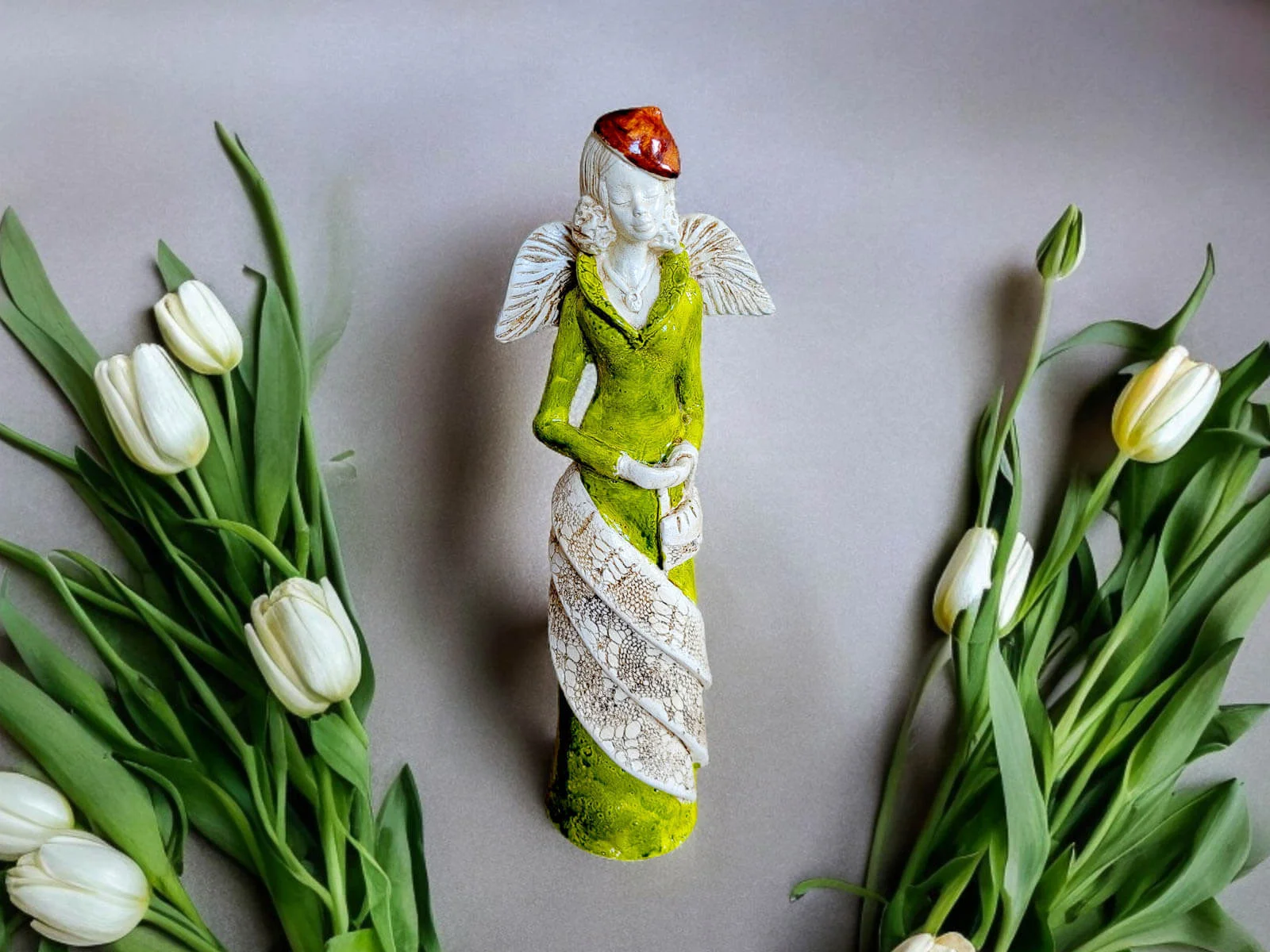 Soll der Engel verschenkt werden, können wir ihn auch elegant in transparentes Zellophan einwickeln und mit ökologischer Schnur umbinden. Dadurch sieht der Engel noch würdevoller aus und ist bereit zum Verschenken. Der Einfachheit halber können Sie auch gleich eine weiße Geschenktüte aus Papier kaufen.